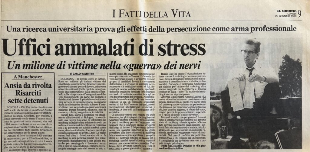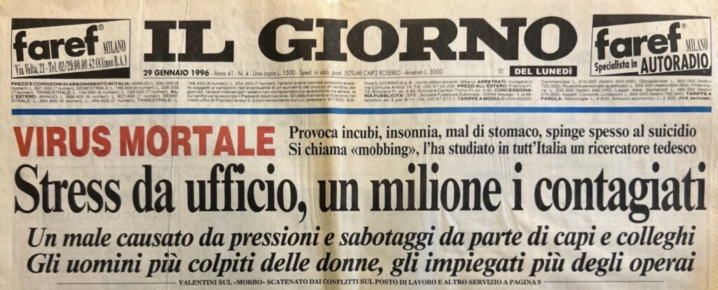 29 gennaio 1996: per la prima volta il Mobbing irrompe sulle prime pagine della carta stampata (“Il Giorno“)