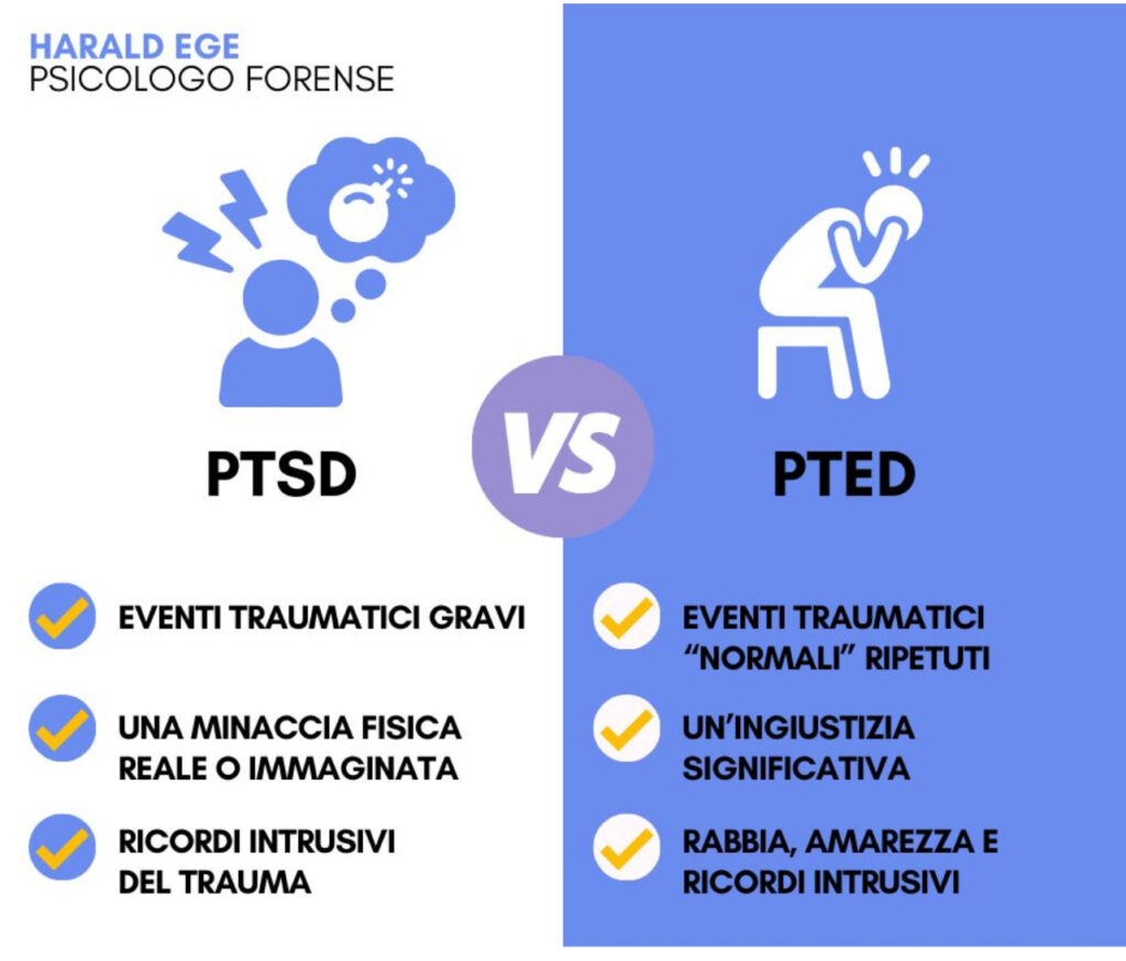 Secondo il dott. Harald Ege, il disturbo più corretto da ricondurre alle vittime di Mobbing e di Straining è il Disturbo Post Traumatico da Amarezza (PTED – Post Traumatic Embitterment Disorder) che è una forma particolare del Disturbo dell’adattamento, che richiede la “presenza di sintomi emotivi o comportamentali clinicamente rilevabili insorti a seguito di un evento di vita negativo, eccezionale ma comunque normale” (Criterio A).